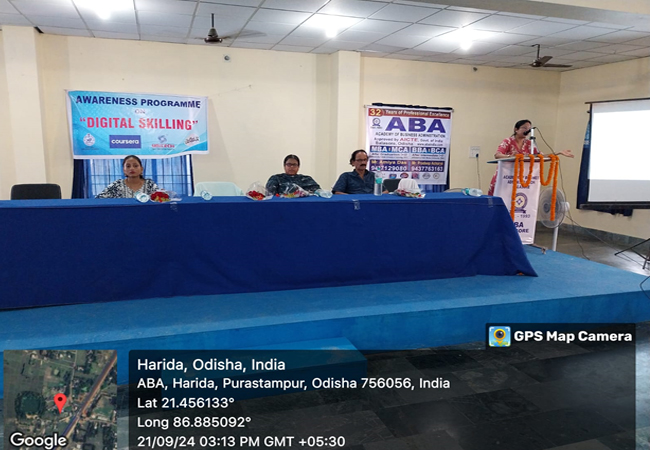 On 21st September 2024, a Digital Skilling awareness program was organized by the Odisha Skill Development Authority (OSDA) at Academy of Business Administration (ABA), Balasore. The program aimed to enhance students’ knowledge about digital skills and their importance in the modern job market. Mrs. Shelly Mohanty, Director (Tech & Adm), Unitech, (COURSERA) highlighted various skill development opportunities, digital tools, and training initiatives available for youth to improve their employability. The program was informative and encouraged students to actively develop digital competencies for better career prospects in the evolving digital economy.